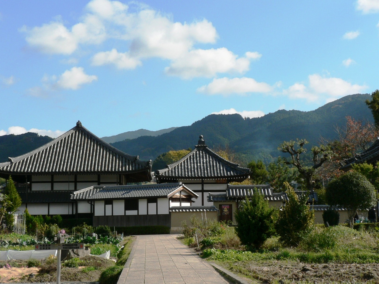 橘寺(たちばなでら)は、明日香村にある天台宗の寺院で本尊は聖徳太子・如意輪観音。橘寺の名は、垂仁天皇(すいにんてんのう・BC69−AD70年)の命で不老不死の果物をとりにいった田道間守(たじまもり)が橘の実を持ち帰って植えたことに由来するそうだ。田道間守(たじまもり)は、日本神話に登場する菓子の神で常世の国(田道間守の祖先の国で新羅といわれる)に渡り10年がかりで捜した橘の葉附きの枝と果実附きの枝を日本に持ち帰ったが、垂仁天皇はすでに亡くなっており、垂仁天皇の皇后と垂仁天皇の御陵に捧げたと伝えられる。近鉄 橿原神宮前駅 飛鳥駅から「かめバス(周遊)」に乗るのが便利。