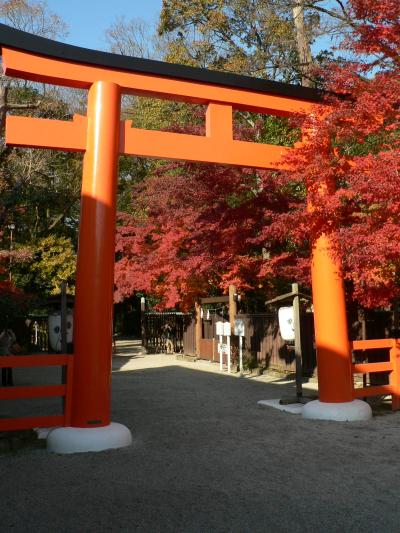 下鴨神社一帯は太古からの原始林が残り、鎮守の森「糺ノ森(ただすのもり)」は古来より紅葉の名所。今年は色づきが遅く12月6日は見ごろだった。森の紅葉もきれいだが神社・鳥居脇の紅葉が一番鮮やかだった。