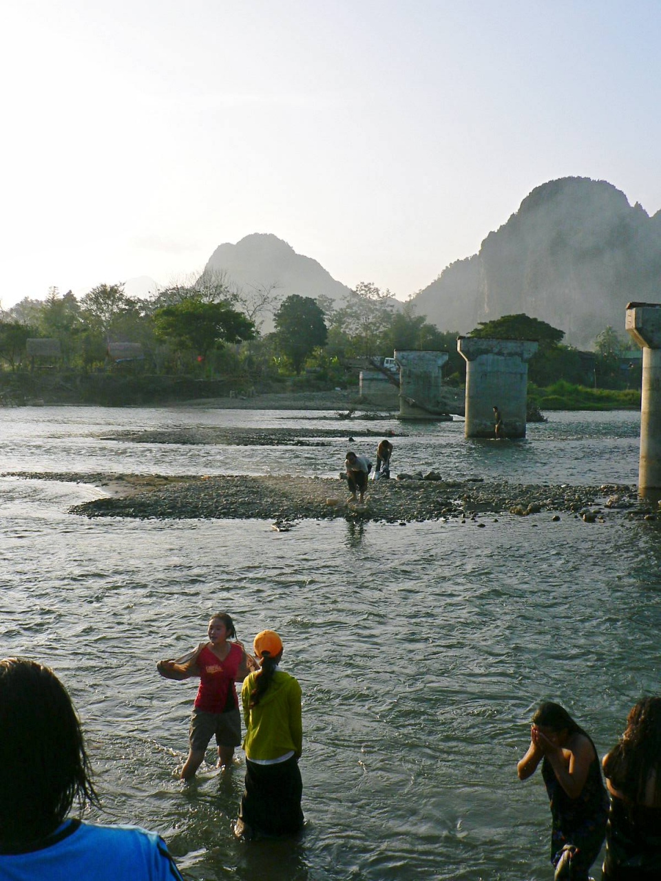 (写真はバンビエンのソン川で水浴する人たち)- 旅行時期