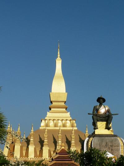 タートルアンはラオス仏教の最高の寺院で、ラオスの象徴と言われている。3世紀頃インドからの使いの一行がブッダの胸骨を納めるためにタットルアンを建立したと伝えられる。1566年にセタティラート王により、四方を四つの寺院に囲まれる形で再建されたが、現在は北と南の寺院が残る。 黄金色に輝くまばゆい寺院だ。拝観料は5000kip・50円だった。