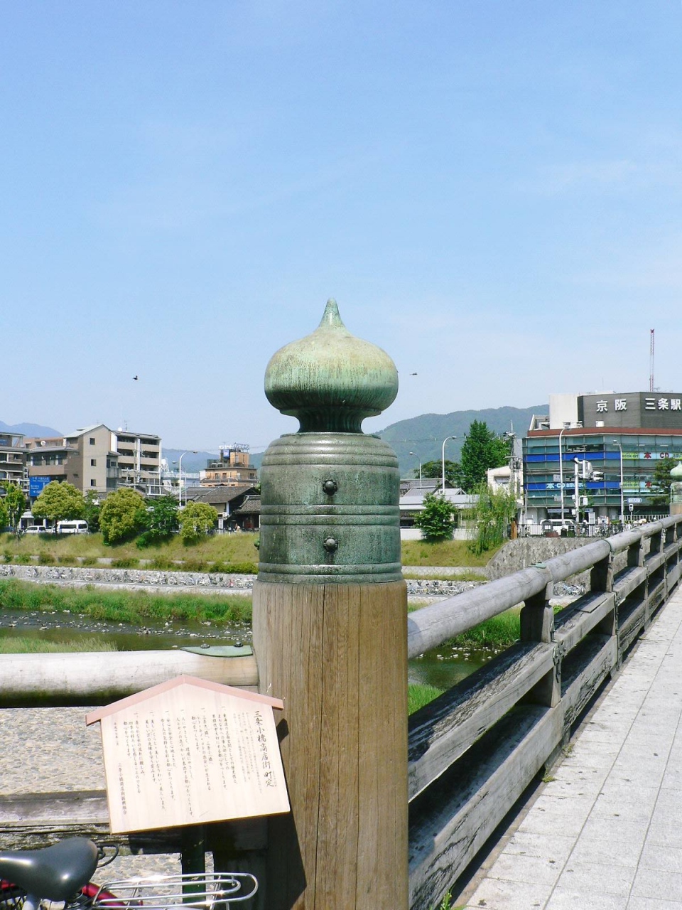 三条大橋(さんじょうおおはし)は京都市、三条通の鴨川にかかる橋。東海道と中山道の終点として東海道中膝栗毛(とうかいどうちゅうひざくりげ)などに登場している。橋の創建は不明だが、豊臣秀吉の時代に改修されており、古くから京都の人たちに親しまれている。欄干には当時の擬宝珠(ぎぼし)が一部残っている。京阪三条駅からすぐ。