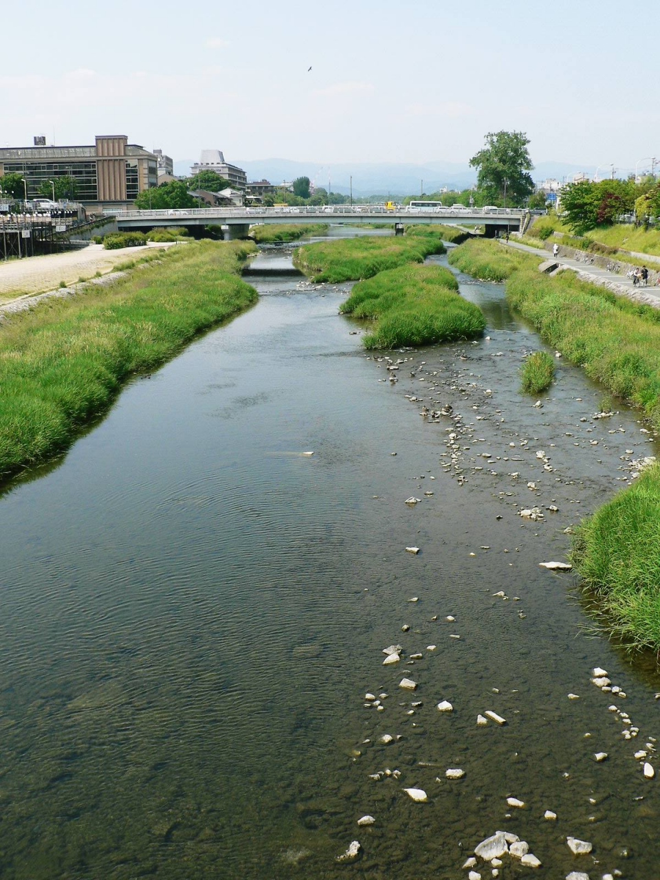 鴨川は京都市北区雲ヶ畑の出合橋付近が源流とされ京都の都心を流れて伏見区下鳥羽で桂川と合流するまで約31キロ。都会を流れる川だが、雲ヶ畑では特別天然記念物のオオサンショウウオを見ることができるし、伊勢物語で描かれた、都鳥(ユリカモメ)の見ることができる。京都は都心から少し北に行くと大自然を味わえる不思議な都会だ。上賀茂神社、下鴨神社など川沿いの文化遺産も多い。賀茂大橋から四条大橋までは古くから河道が作られており、現代でも老若男女の散歩、デートコースになっている。