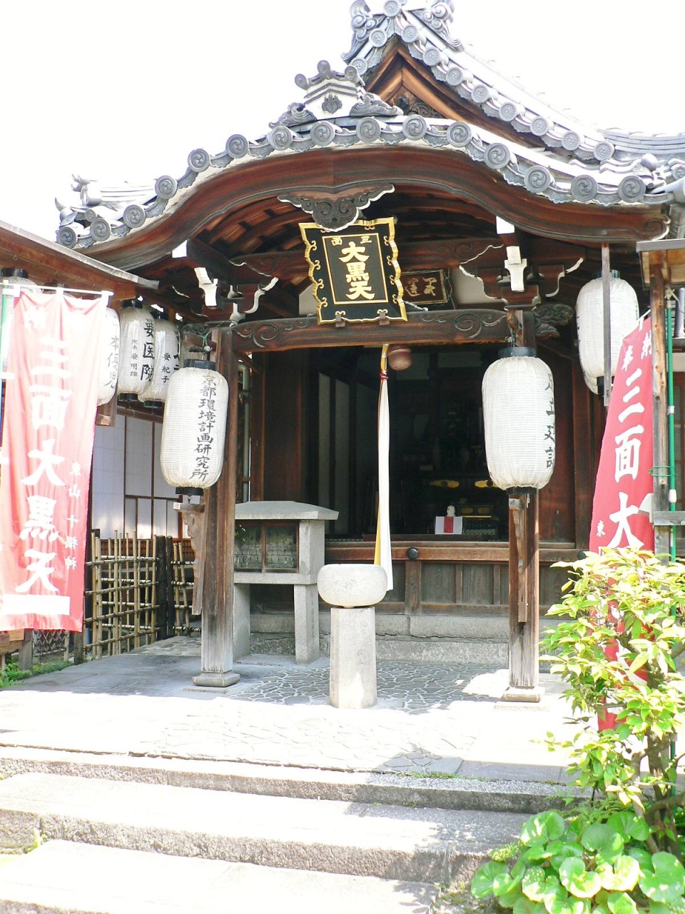 三面大黒天は圓徳院の北側に祀られている。秀吉が念持仏とした三面大黒天は北政所が祀ったもので、大黒天、毘沙門天、弁財天、の三面を併せ持つ。富と福と呼び込む神「大黒天」、権力を握りすべてを意のままにする神「毘沙門天」、人生を切り抜ける機知と美女を呼ぶ神「弁財天」、三尊のご利益を得ることができるそうだ。確かに秀吉の最盛期には三尊のご利益があったようだ。市バス「東山安井」下車、東へ徒歩約5分。