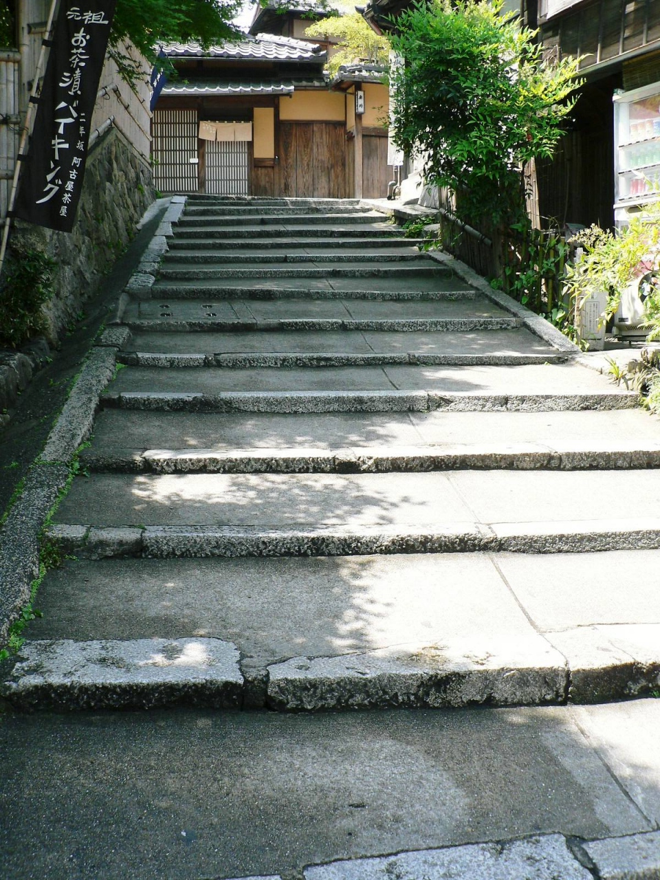 二寧坂(二年坂)の名の由来には、三年坂に比べて小さな坂という事から来ているという説、大同2年(807年)に出来たからとする説などがある。