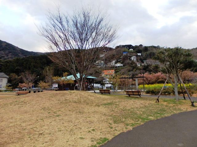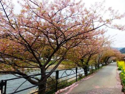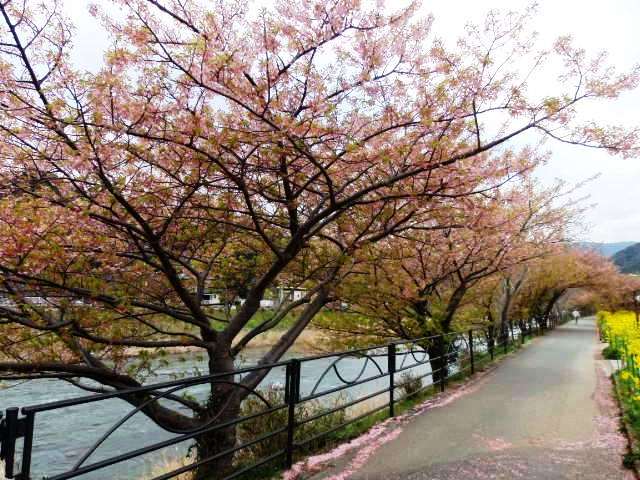 河津町では1981年より毎年2月10日前後から3月10日前後にかけて河津桜まつりが開催される。河津駅近辺の河口から河津川にそって「河津桜並木(かわづざくらなみき)」が約3km続いており毎年この時期になると大勢の観光客でにぎわい夜にはライトアップされる。3月14日は河津桜まつりは終了していたが桜はまだ少し残っていた。
