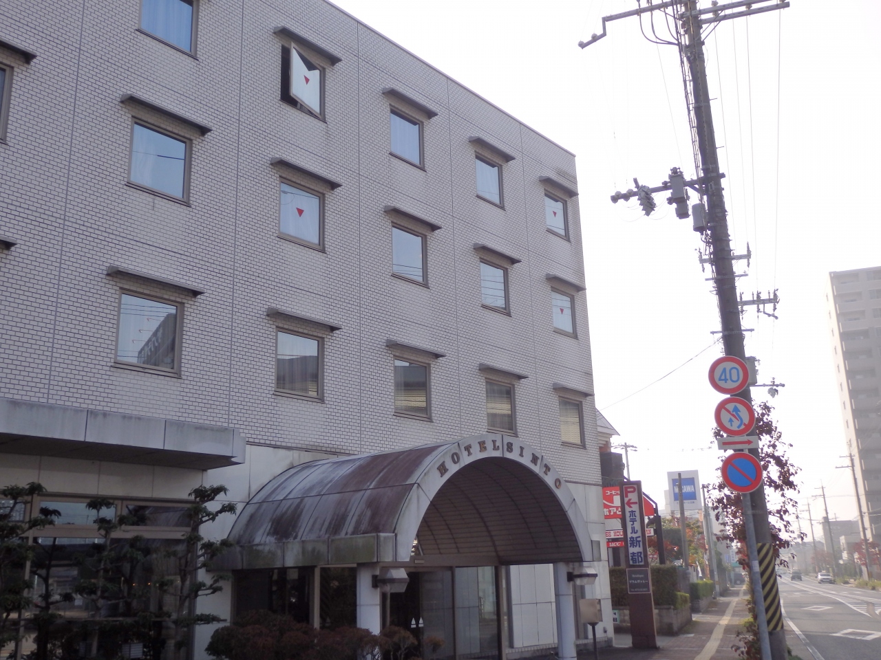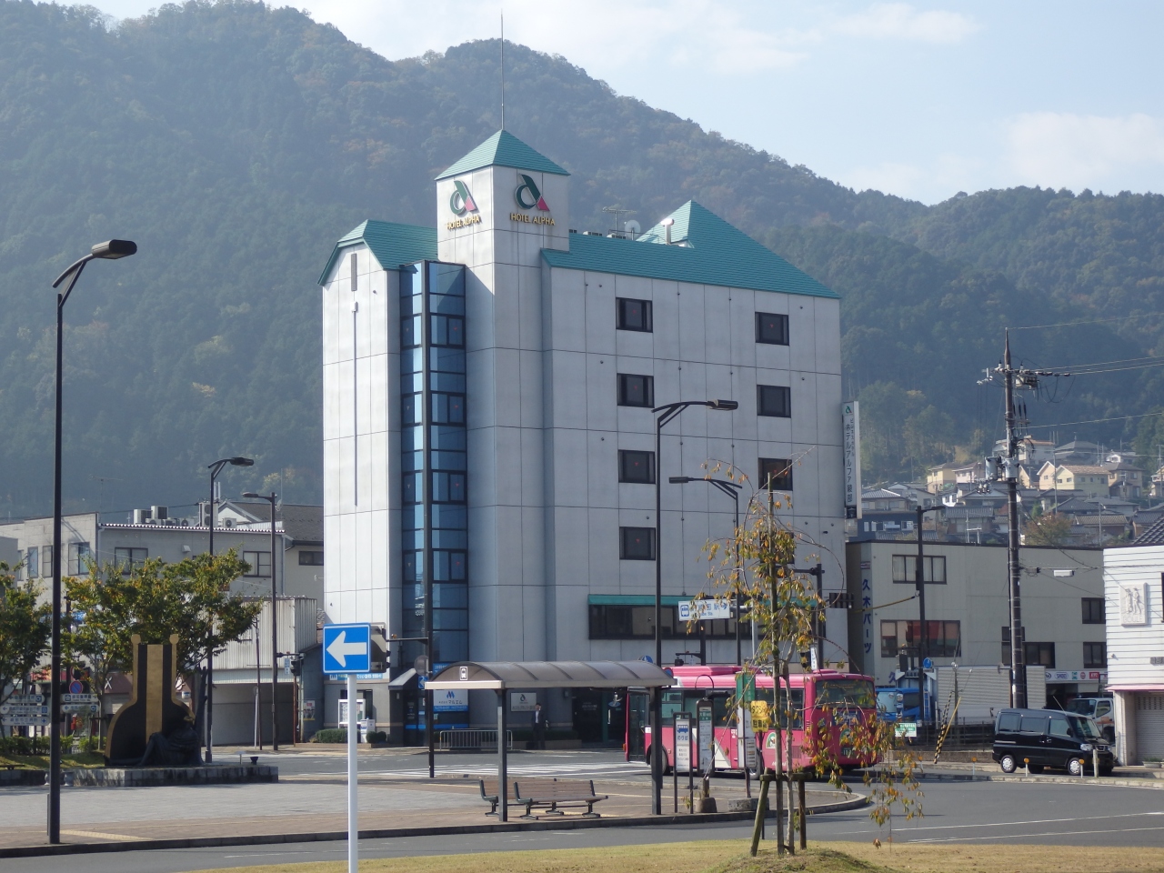 ロータリー内にある。ホテルを囲むようにして駐車場がある。綾部駅の北口側は南口側に比べて店が少なく夜は寂しい。- 旅行時期