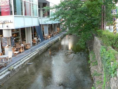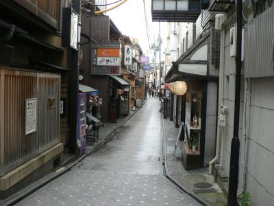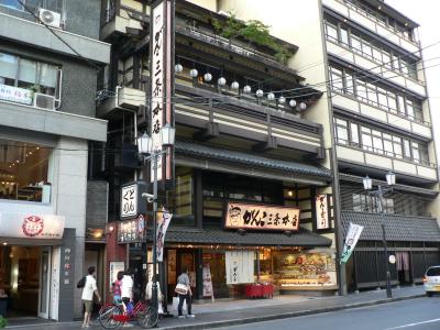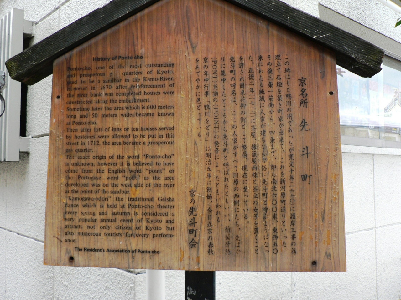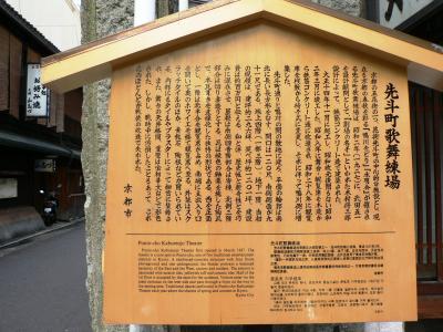 先斗町(ぽんとちょう)は京都市中京区の鴨川と木屋町通の間にある花街でもとは鴨川の州で江戸時代初期の1670年に護岸工事で埋立てられ新河原町通と呼ばれ茶屋、旅籠などが置かれたのが始まりとのこと。1872年に鴨川をどりが初演され先斗町は花街として繁華街となり現在は鴨川と木屋町通の間を南北に走る石畳の狭い通り。通り東側の店は鴨川に面し納涼床を設ける飲食店が多く先斗町歌舞練場は北の端にある。