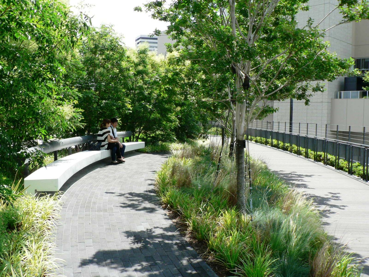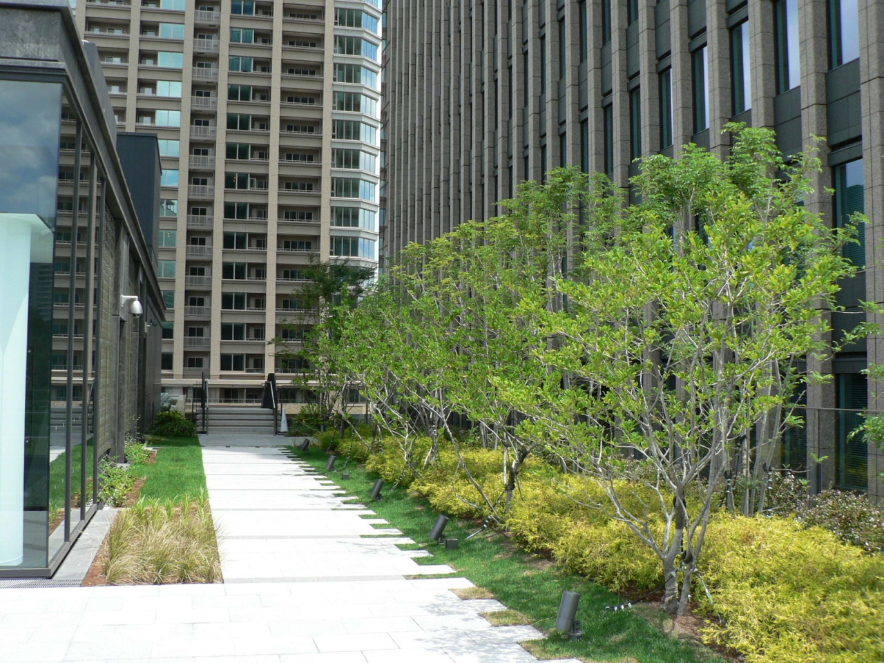 グランフロント大阪の各所には人の交流や賑わいを創造する広場や歩道空間が整備されており歩道にケヤキ並木やイチョウ並木を配置し四季折々の自然を提供している。