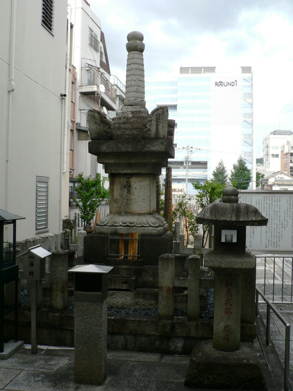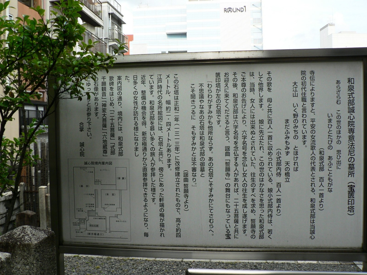 謡曲 誓願寺には『わらわがすみかも他所ならず。あの石塔こそすみかにてさむらへ。 不思議やなあの石塔は和泉式部の御墓と こそ聞きつるに そもすみかとは不審なり。』と平安の歌人和泉式部の墓が登場するが、誓願寺近くの誠心院(せいしんいん)に和泉式部の墓がある。