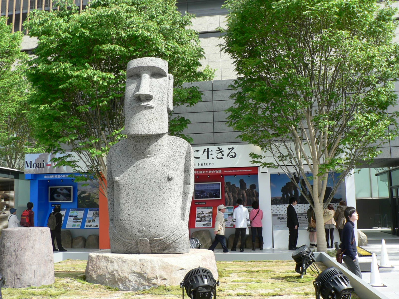 モアイはチリ領イースター島にある人面を模した石造彫刻のこと。島の海に面したアフと呼ばれる高台に、多くの場合海を背に向けて多数建てられている。大きさは3.5m、重量20トン程度のものが多いが最大級のものは20m、重量は90トンに達する。島で産出される凝灰岩でできており、建造中に放置されたものも含め約1000体ある。大阪駅北側にある、「うめきた広場」の一画に、「モアイ像」が展示された。 南米チリ・イースター島で制作された巨大石像「モアイ像」で、東日本大震災で被災した宮城県南三陸町に、チリ政府から寄贈。 2013.5.9日まで披露したあと、宮城県へ移送されたとのこと。
