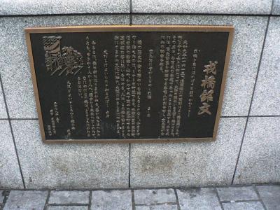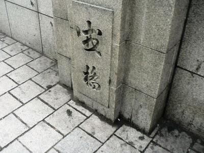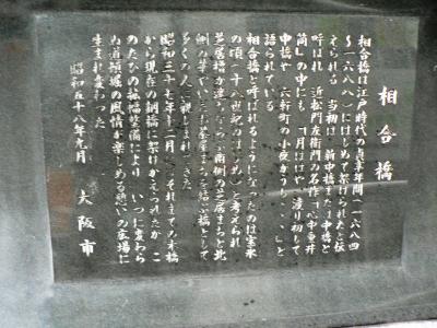 相合橋が最初に架けられたのは1680年代で近松門左衛門の浄瑠璃『心中重井筒』の一節にも中橋として登場しており江戸時代の頃は渡ると男女の縁が切れる「縁切り橋」ともいわれ婚礼の行列はこの橋を渡らなかったとのことだが相合橋と呼ばれるようになった由縁は「北側の芸者町と南側の芝居町をこの橋が繋いでいたから」、「長堀に架かる中橋と相合橋がちょうど真っすぐに通じあっていたから」とか諸説あるそうだ。