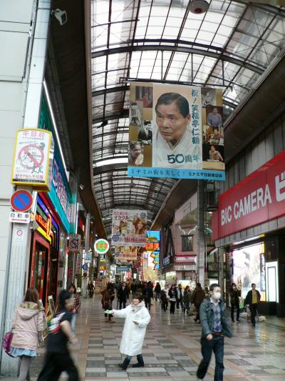 千日前(せんにちまえ)道頓堀の南東、演芸場や映画館などがある娯楽街で法善寺、竹林寺があり千日念仏を唱えていたことから両寺の別名(特に法善寺)を千日寺といいその前で栄えた街で千日前と呼ばれるようになったといわれる。現在は大阪を代表する商店街のひとつだ。