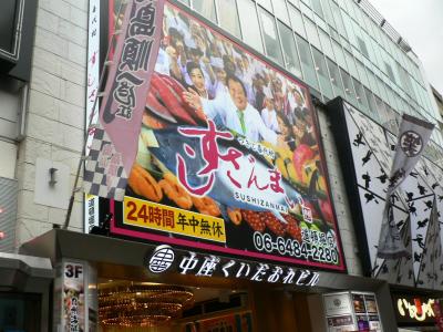 中座くいだおれビルはたこ焼き、お好み焼き、串カツなど大阪グルメを「くいだおれ」できるビルでエントランスにはくいだおれ太郎が立っている。