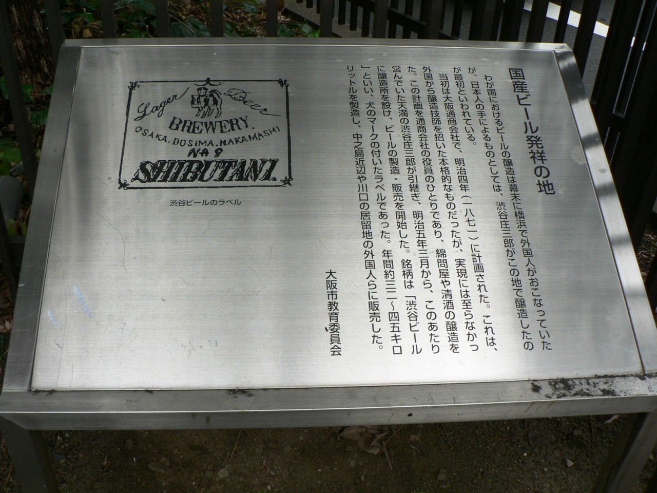 大阪通商会社で1871年に外国から醸造技師を招きビール醸造する計画が立案されたが実現せず通商会社の役員のひとりで綿問屋や清酒の醸造を営んでいた天満の澁谷庄三郎が引継ぎ1872年に醸造所を設けビールの製造・販売を開始した。銘柄は「澁谷ビール」で犬のマークの付いたラベルであった。年間約32~45キロリットルを製造し中之島近辺や川口の民留地の外国人らに販売したとのこと。北新地はビールを飲んで楽しむだけでなく、醸造もする場所だったようだ。- 旅行時期