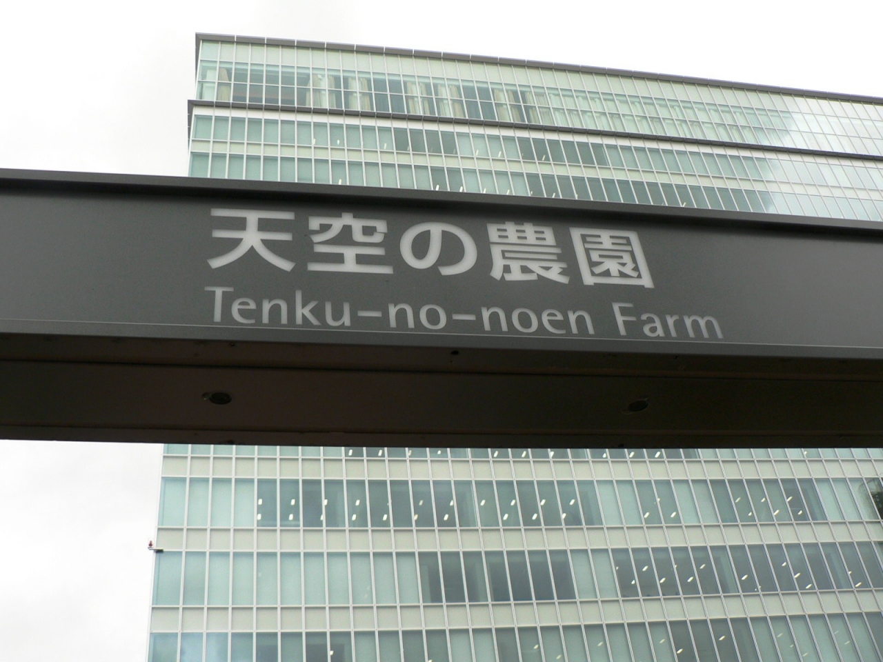 JR大阪駅の天空の農園は駅ビルの屋上に造られた農園。果樹園にはぶどう、さくらんぼ、あんず、きんかん、ブルーベリー、柿、夏みかん、栗など野菜畑にはキャベツ、トマトなど季節の野菜が育てられるとのこと。植え付けや収穫の体験イベントも計画されており、風車や太陽光の再生可能エネルギーで発電し場内の照明に使用しているそうだ。