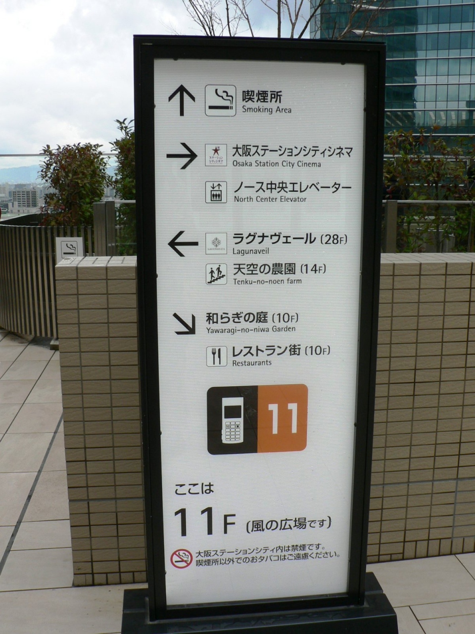 JR大阪駅の風の広場は日本庭園を意識した10階の屋上広場と階段でつながるエリアで階下とは趣の異なるイングリッシュ・ガーデン風の庭園を造っている。バラの花などの植栽、樹木、水辺を設けた欧風の広場でウッドデッキにパラソルやポールを配している。11階はサポートフロアとしてコンビニ、ATM,旅行会社、カフェ、キッズルームなどがある。