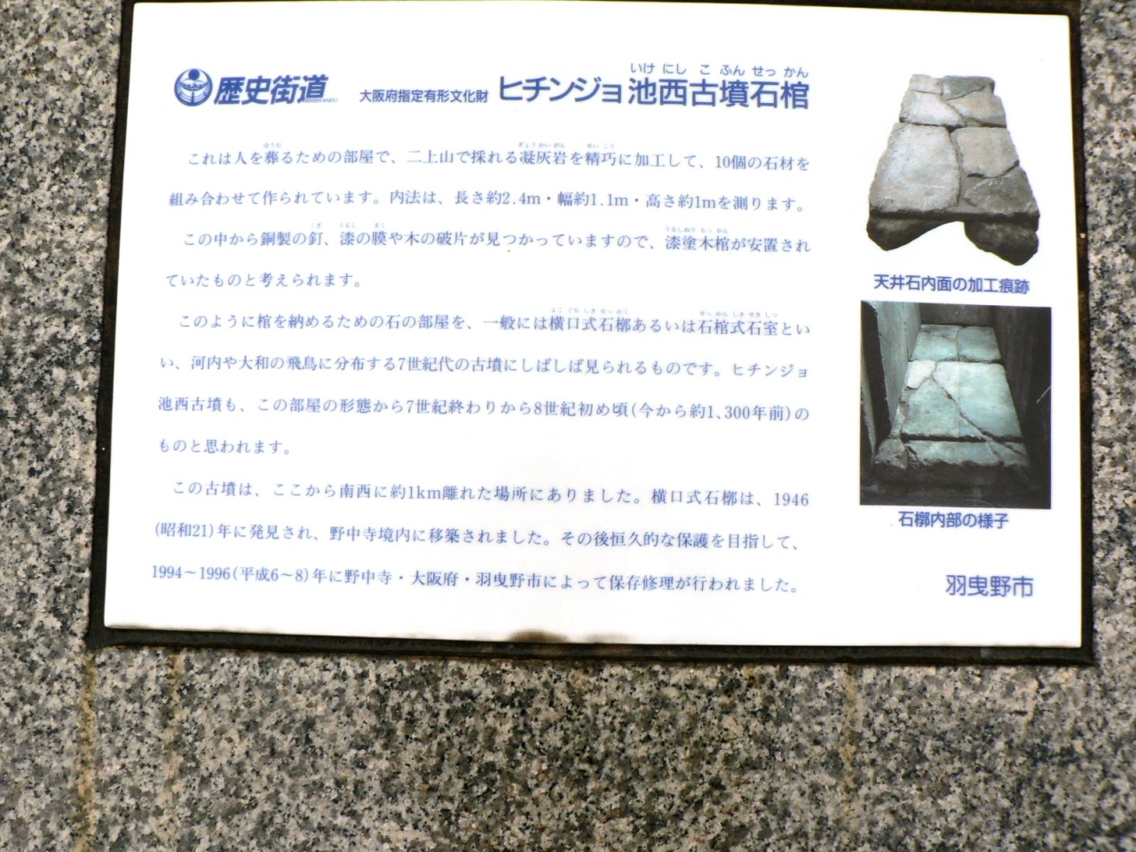野中寺境内にあるヒチンジョ池西古墳石棺は塚穴古墳(来目皇子墓−くめみこのはか)の西方にあった古墳で1948年頃の開墾(かいこん)の際に発見された横口式石槨の古墳。横口式石槨は精巧に加工した凝灰岩(ぎょうかいがん)を組み合わせて作られており内部からは銅製釘や黒漆(くろうるし)の残片が見つかっているので漆を塗った木棺が安置されていたと考えられている。横口式石槨の形態などから7世紀末葉に築造されたものとみられ発見直後に野中寺境内に移され1973年に大阪府指定文化財になっている。