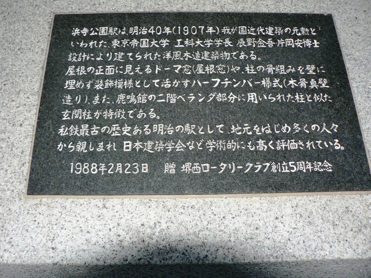 浜寺公園駅(はまでらこうえんえき)は、大阪府堺市西区浜寺公園町の南海電気鉄道南海本線の駅。日本銀行本店(1898年)東京駅(1914年)中之島中央公会堂(1918年)などの設計に携わった日本の明治・大正時代を代表する建築家辰野 金吾 (たつの きんご、1854−1919年)の設計により1907年に建てられた木造平屋建ての駅舎は私鉄最古で、1988年に国の登録有形文化財に登録された第1回近畿の駅百選選定駅。