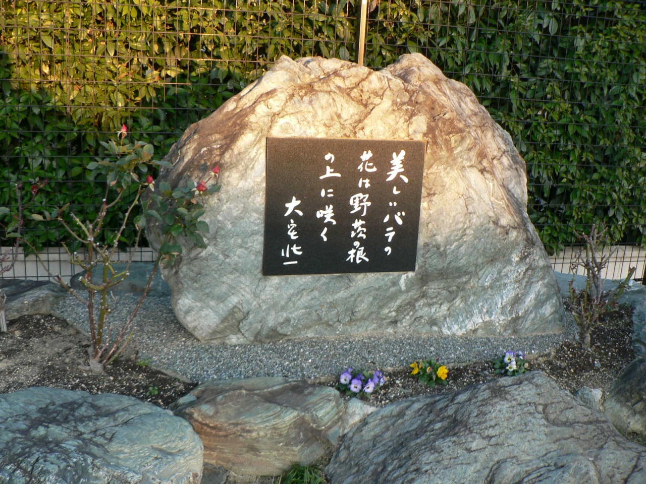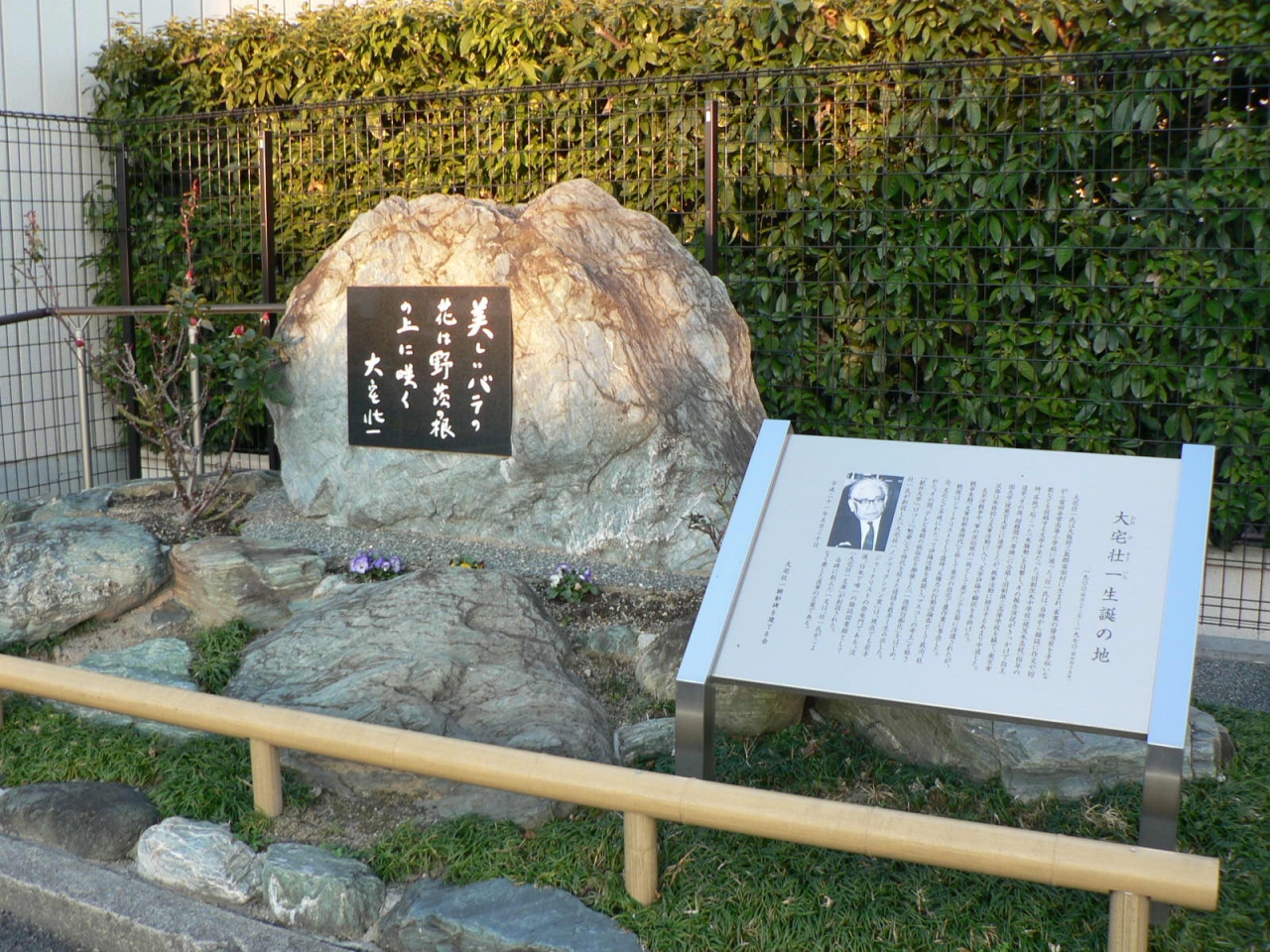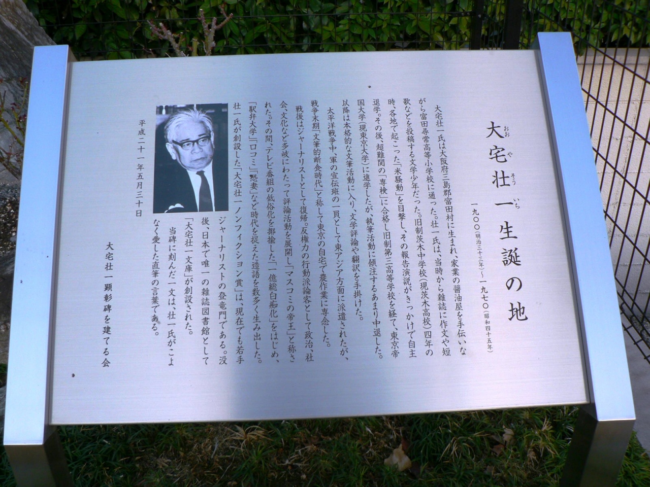 高槻市冨田(とんだ)町には「大宅壮一顕彰碑」が生家近くの府道わきに建立されている。地元有志による「大宅壮一顕彰碑を建てる会」により、大宅壮一氏直筆の「美しいバラは野茨の根の上に咲く」という言葉が自然石(高さ1.4m、幅2.7m)の碑に彫りこまれ、生前の活躍を称えている。