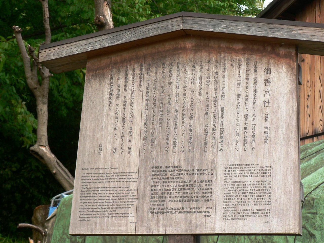 仏国寺(ぶっこくじ)に近い古御香宮(ふるごこうのみや)は、深草大亀谷敦賀町を中心とする「峠」一帯の氏神。1594年、豊臣秀吉は伏見築城にあたり、城内鬼門除けの神として伏見九郷の石井村にあった「御香宮」をこの地に遷し、本殿等を造営して社領300石を寄進した。秀吉の没後、天下人となった徳川家康は1605年、この神社を再び元の地に戻した。こうした経緯から地元の人々より「古御香宮(ふるごこうのみや)」と呼ばれ、十月御香宮神幸祭には神輿の御旅所として神輿渡御があるとのこと。