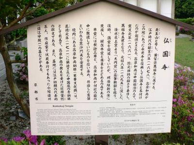 仏国寺(ぶっこくじ)は黄檗宗万福寺(おうばくしゅうまんぷくじ)に属し1678年に高泉性敦(こうせんしょうとん、1633−1695年)がこの場所にあった永光寺を復興して仏国寺と名づけたのがはじまりとのこと。高泉和尚は中国福清から1661年に隠元禅師の招きで来日し万福寺5世となった。往時に講堂を完備していたが明治維新の後荒廃し、現在本堂と庫裏をとどめるのみ。境内には開山高泉碑(重要文化財)があり、1711年鋳造の中国風の銅碑がある。江戸初期の代表的茶人、作庭家で伏見奉行でもあった小堀遠州(こぼり えんしゅう=遠江守政一1579−1647年)の墓などがある。小堀遠州は現在の滋賀県長浜市小堀町で生まれ江戸時代初期の近江小室藩主であり、徳川幕府の作事奉行、大名茶人、造園など多種にわたり活躍した。