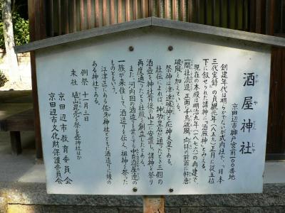 酒屋神社(さけやじんじゃ)は京田辺市役所の南にある神社で現在の本殿は明治9年(1876年)の再建で一間社流造、正面に千鳥破風向拝の前面軒唐破風を加えている。津速魂神(天児屋根命の祖父)と応神天皇を祭神とし社伝によると神功皇后が三韓に出兵するとき三個の酒壺を神社背後の山中に安置して諸神を祭り、帰国後その霊験を喜んで社伝を創立したとされる。