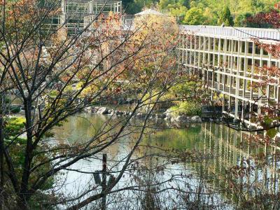 「流れ橋」は普通の木造橋だと増水の度に流されてしまうので欄干が無い平坦な形で特殊な構造になっている。木津川が増水して橋面まで水に浸かると8つに分割されている橋板はワイヤーで橋脚に繋がれており、橋板は橋脚から離れ自然に浮かび流れに逆らわず筏のように川に浮かび水が引けば8つの橋板を橋脚に並べ直し元の橋の形に修復するとのことだった。10月8日の台風18号の直撃の直撃では流れの激しさが橋の強度を上回ったのだろう、すぐには修復できないほど破壊され無残な姿になっていた。