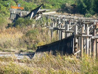 京都・八幡の「流れ橋」は木津川に架かる八幡市と久御山町を結ぶ上津屋橋(こうづやばし)の通称で全長約356.5m幅3.3mの現存する木橋では日本で最も長い橋とのことだが2009年10月8日の台風18号の直撃によって破壊されていた。