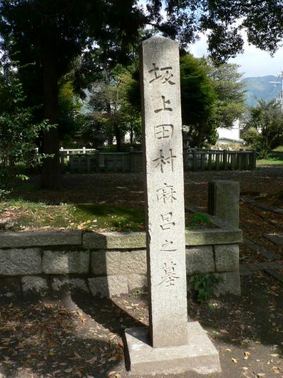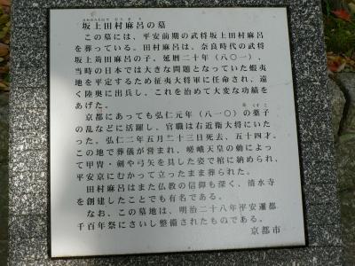 坂上田村麻呂の墓は山科区勧修寺東栗栖野町,坂上田村麻呂公園内の古墳とされている。清水寺境内の平安遷都1200年記念で1994年に建てられた「アテルイ・モレ顕彰碑」と同様に,平安遷都1100年記念で有志が墓所修理と建碑を1894年に行っているそうだが、公園の隅にひっそりと墓碑が建っていた。