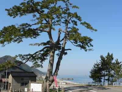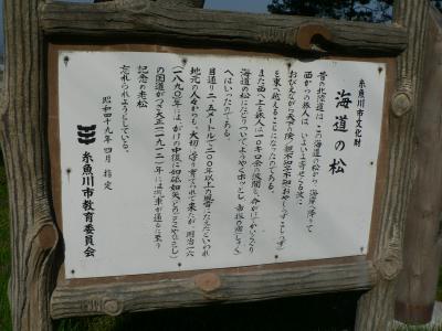 海道の松は市振宿の海岸に細長く伸びる市振集落の東端に立っている。市振宿(松尾芭蕉「奥の細道」中の「一家(ひとつや)に遊女もねたり萩と月」の句で知られる)のはずれで北国街道には、ここより北に道らしい道はなく、海岸の断崖の下にできたわずかな波打ち際を走り抜けるように通過した。世にいう親不知・子不知の難所だ。 越後から京に向かう旅人は、この海道の松を目にして、やっと難所を通過できたことを実感したそうだ。現地の案内板によるとクロマツ、樹高 30m、目通り幹囲 3.5m、