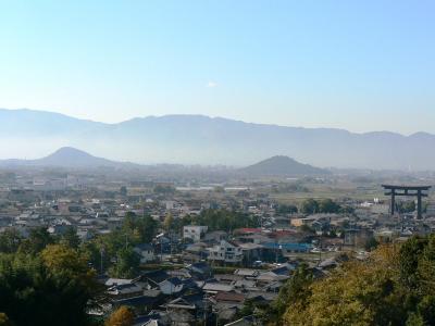 万葉集などに古代より登場する大和三山は『畝傍山』・『耳成山』・『香具山』。大和盆地に浮かんだ島のような大和三山の『畝傍山』・『耳成山』・『香具山』は大物主大神(おおものぬしのおおかみ)が鎮座する三輪山を祀る大神神社境内の展望台から良く見える。