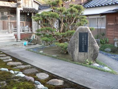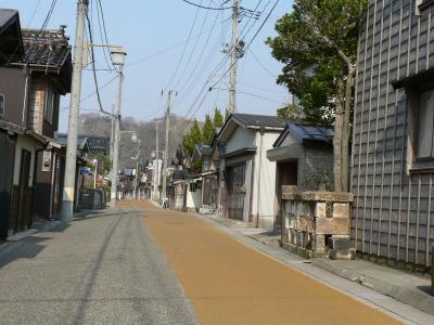 出雲崎町の妻入りの街並みは見所のひとつで海岸線に沿い約4kmも続いており、これは日本一の長さとのこと。江戸時代の出雲崎町は越後で一番人口密度が高く、多くの人が居住できるように間口(まぐち)が狭く、奥行きの長い妻入りの形式がとられていた。当時は間口によって税金が掛けられていたとのことで、二間や三間半の家が多く並んでいる。江戸時代、徳川幕府の直轄地(天領)であった出雲崎は佐渡金銀の荷揚げや北前船の寄港地で、北国街道の宿場町として栄え廻船問屋街、旅館街が立ち並び、狭い街に2万人もの人たちが生活していたそうだ。全国でもめずらしい「妻入りの街並」の散策に訪れる人も多いとのこと。良寛記念館から見下ろすと出雲崎町の妻入りの街並みが良く見える。