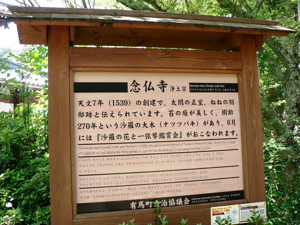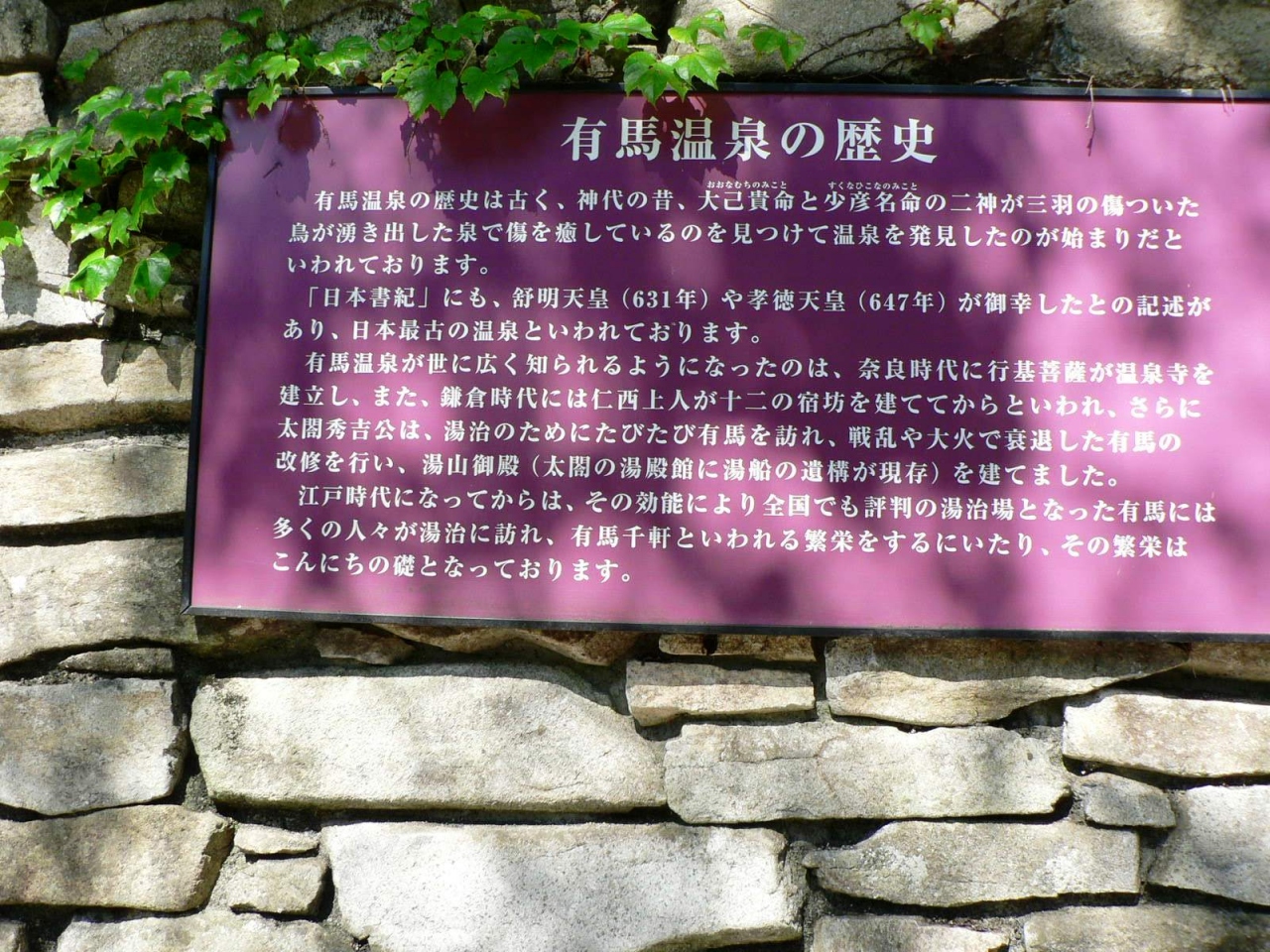 有馬温泉(ありまおんせん)は、兵庫県神戸市北区の温泉で関西の「奥座敷」とも称され日本三古湯の一つで林羅山の日本三名泉や枕草子の三名泉にも数えられる名実ともに日本を代表する名泉の一つ。奈良時代に僧行基が温泉寺を建立しており温泉寺前に行基像と有馬温泉の歴史の説明板がある。