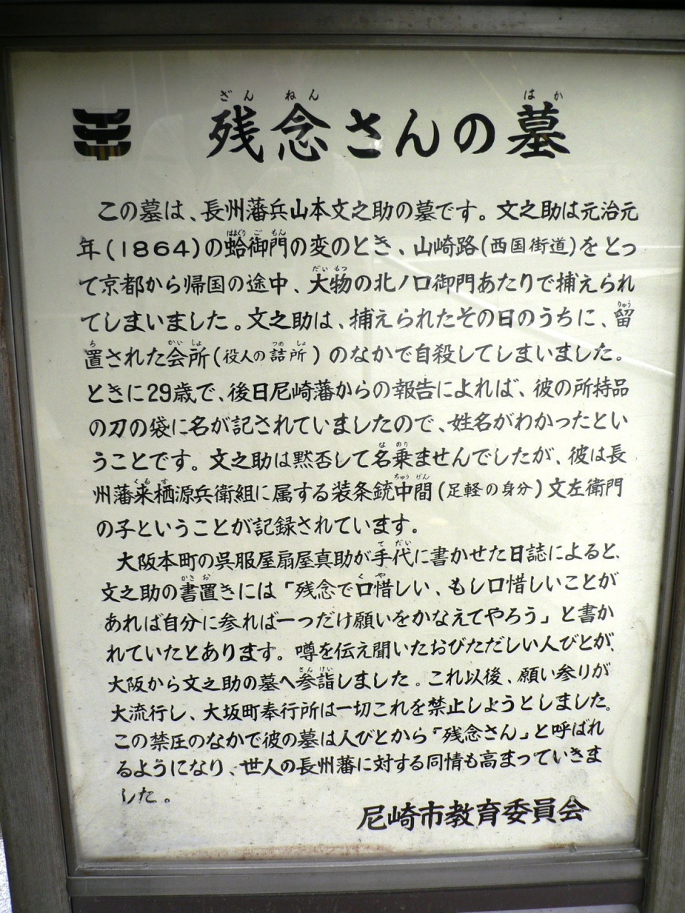 残念さんは1865年頃にひろがった信仰で、幕末期非業の死をとげた人への同情が民衆の反幕思想に拍車をかけたといわれている。大和天誅組の変で憤死した吉村寅太郎(よしむら とらたろう1837−1863年)の墓に1864年頃から参詣する人が増えている時期に禁門の変で京都から敗走してきた長州藩の山本文之助が尼崎北の口門で逮捕され、尼崎藩の取調べ中「残念残念」といって自害した。1865年には民衆が尼崎の東墓(杭瀬字松ヶ下)に群参した。領主の禁制の中、大坂からも大勢の参詣人がつづき、残念さんのお墓はやがて「願かけ神様」として多くの人々に信仰されるようになった。林 芙美子(はやし ふみこ1903−1951年)が1951年に朝日新聞に連載したが林が急逝したことで未完の絶筆となった「めし」にも残念さんに願かけに参る場面が登場する。