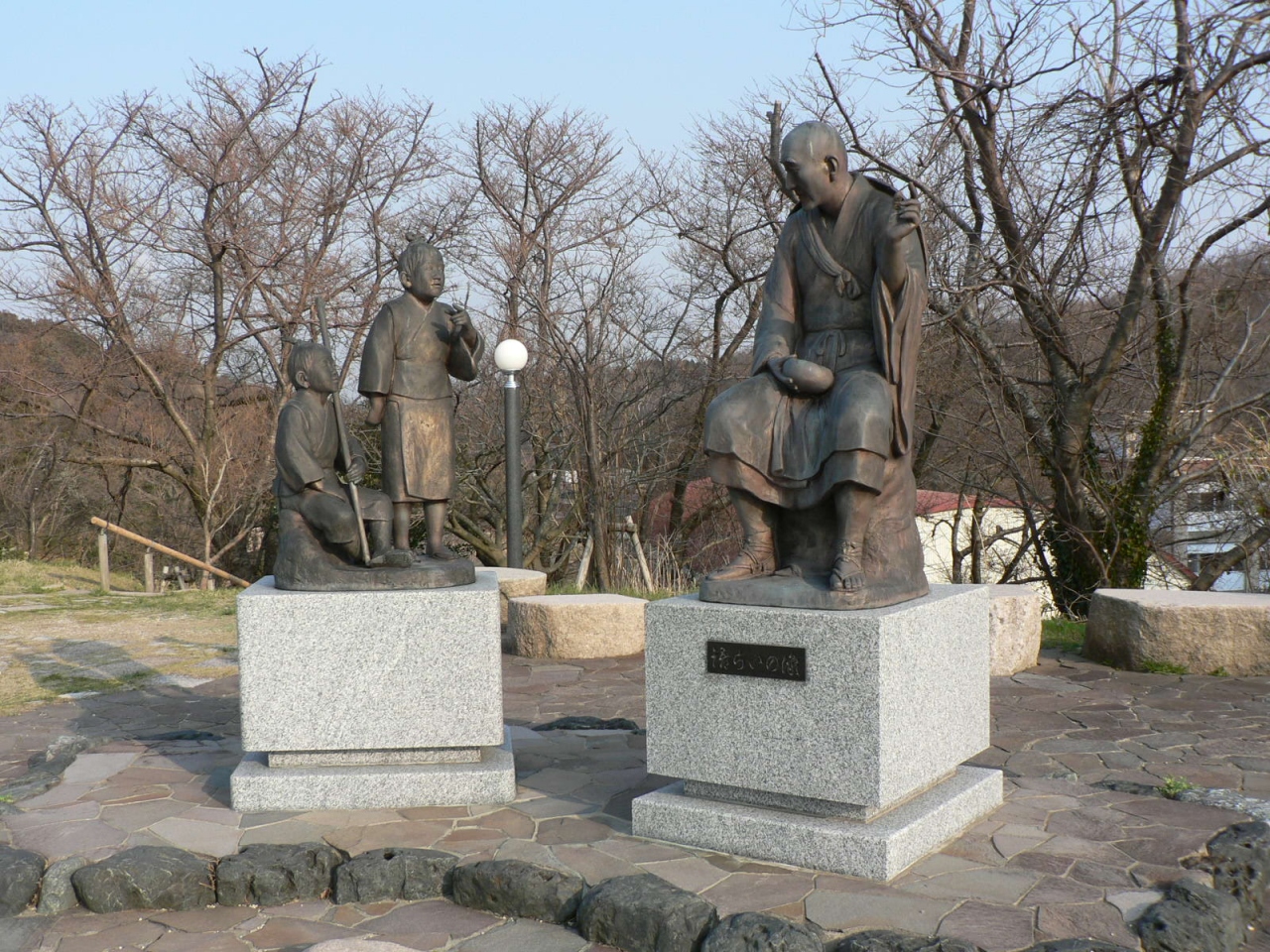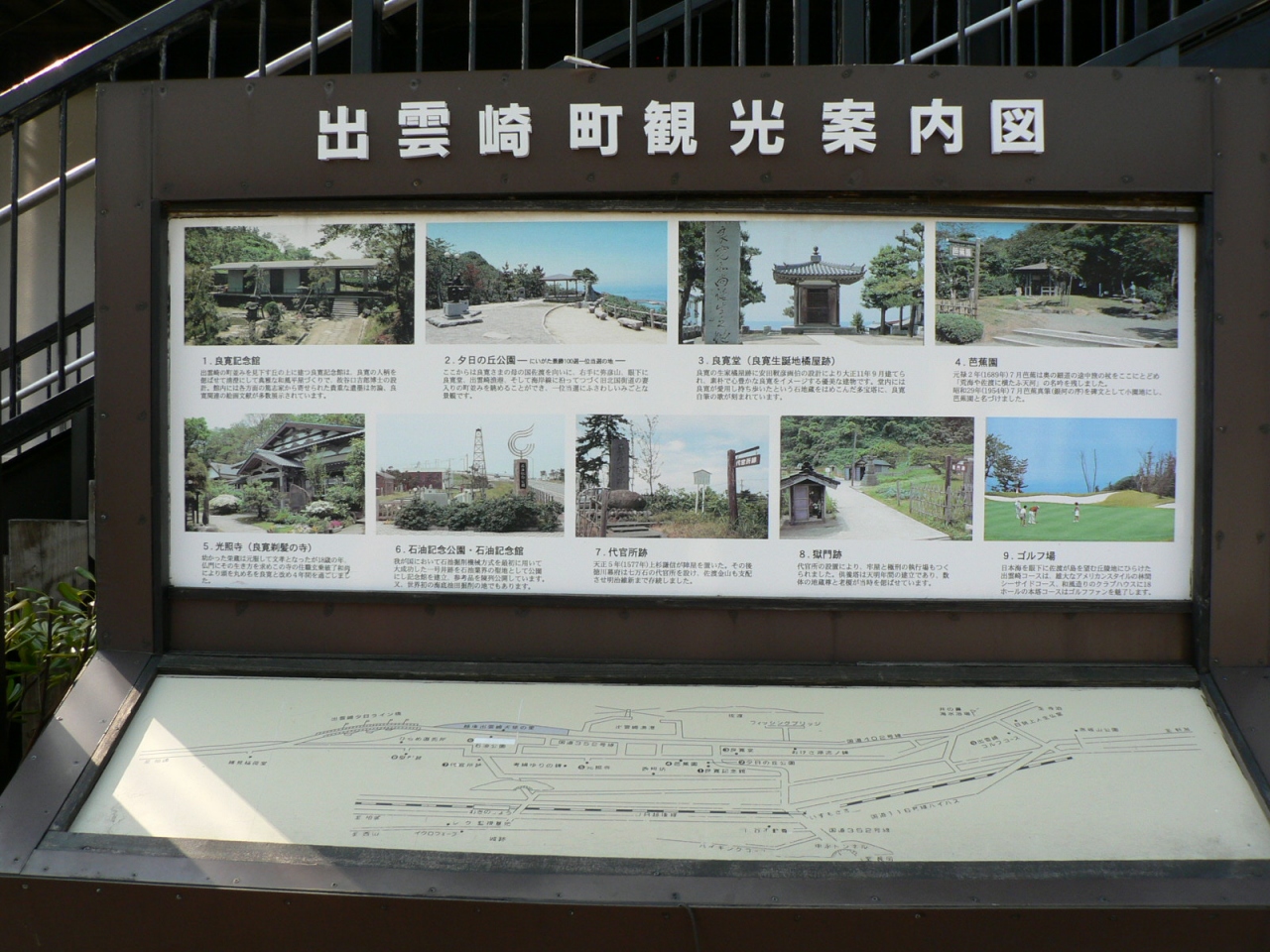 良寛と夕日の丘公園には良寛の歌碑があり正面に佐渡島右手に弥彦山、眼下に良寛堂・出雲崎漁港・海岸線に続く妻入りの街並みを見ることができる。良寛と夕日の丘公園から見る光景は美しく、「新潟景勝百選」の1位に選ばれている。ここには種田 山頭火(たねだ さんとうか1882−1940年)の詩碑もあった。種田 山頭火は芭蕉と同じ旅の詩人だった。