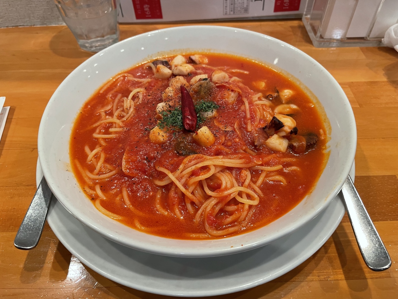 普通とスープパスタのハイブリッド版でたっぷりですが、味はあっさりとしていました。