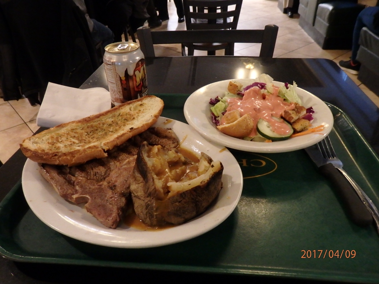 カフェテリア的なオーダーをして、ステーキを焼いて貰います。一番安いステーキコンボ(セット)はサラダとガーリックトーストがついて$10以下(税別)でいただけます。味は想像通りのもの。サラダのサウザンアイランドドレッシングは塩辛いので注文しないほうがいいかも。- 旅行時期