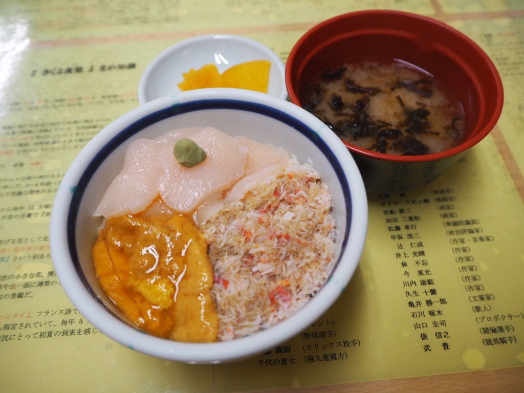 今回はきくよ食堂でミニ3色丼にしました。塩水うに、帆立、カニを選んで美味しくいただきました。- 旅行時期