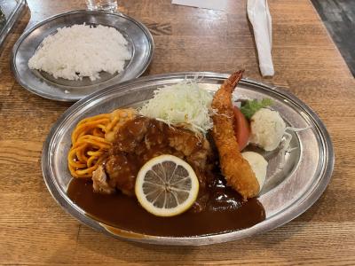 デミグラスのかかったチキンピカタ(スパイスが米国風)、懐かしい味のしたマヨネーズ添えの海老フライ、付け合わせのナポリタン風スパゲティなど、価格・味共に大満足ですね。