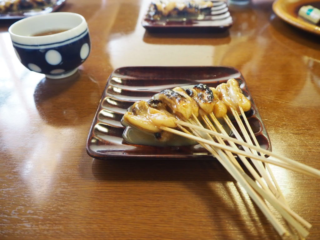 竹に刺した小ぶりの餅をきな粉を付けて、炭火で炙り白味噌の甘いタレをかけたものです。