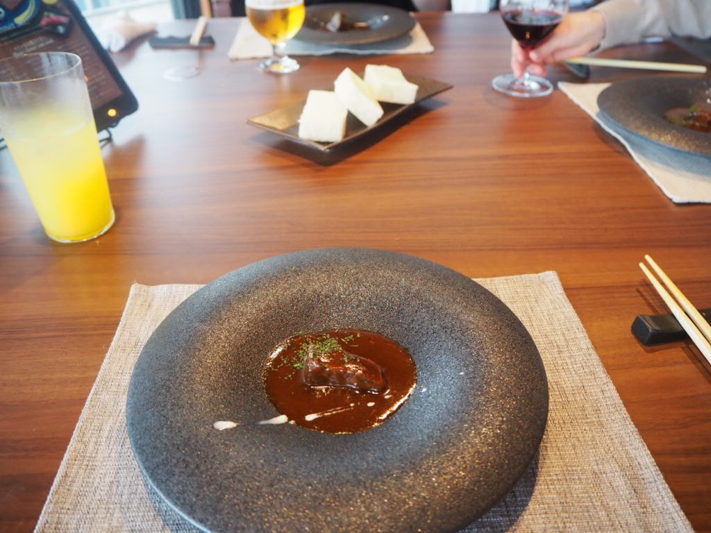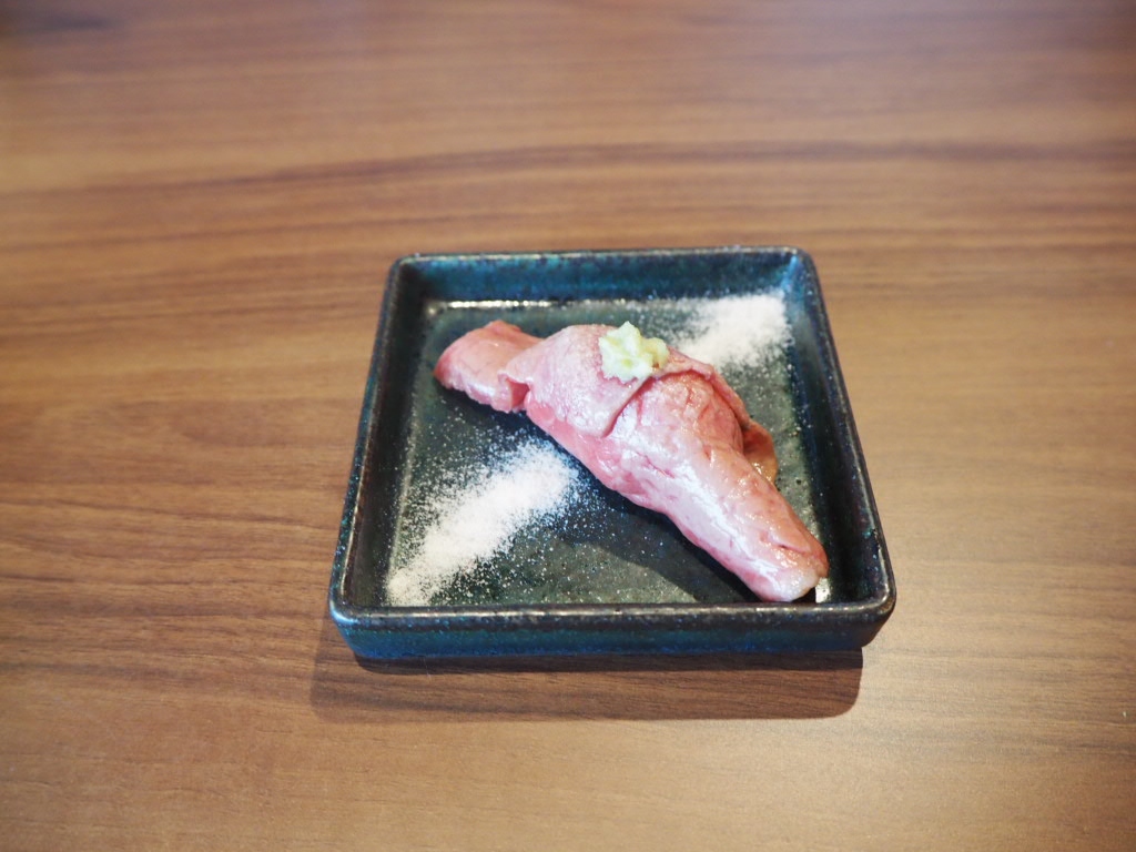 ステーキが出る前に、スープ、サラダ、牛炙り寿司、牛デミグラスソース、あぐーしゃぶしゃぶがサーブされて、