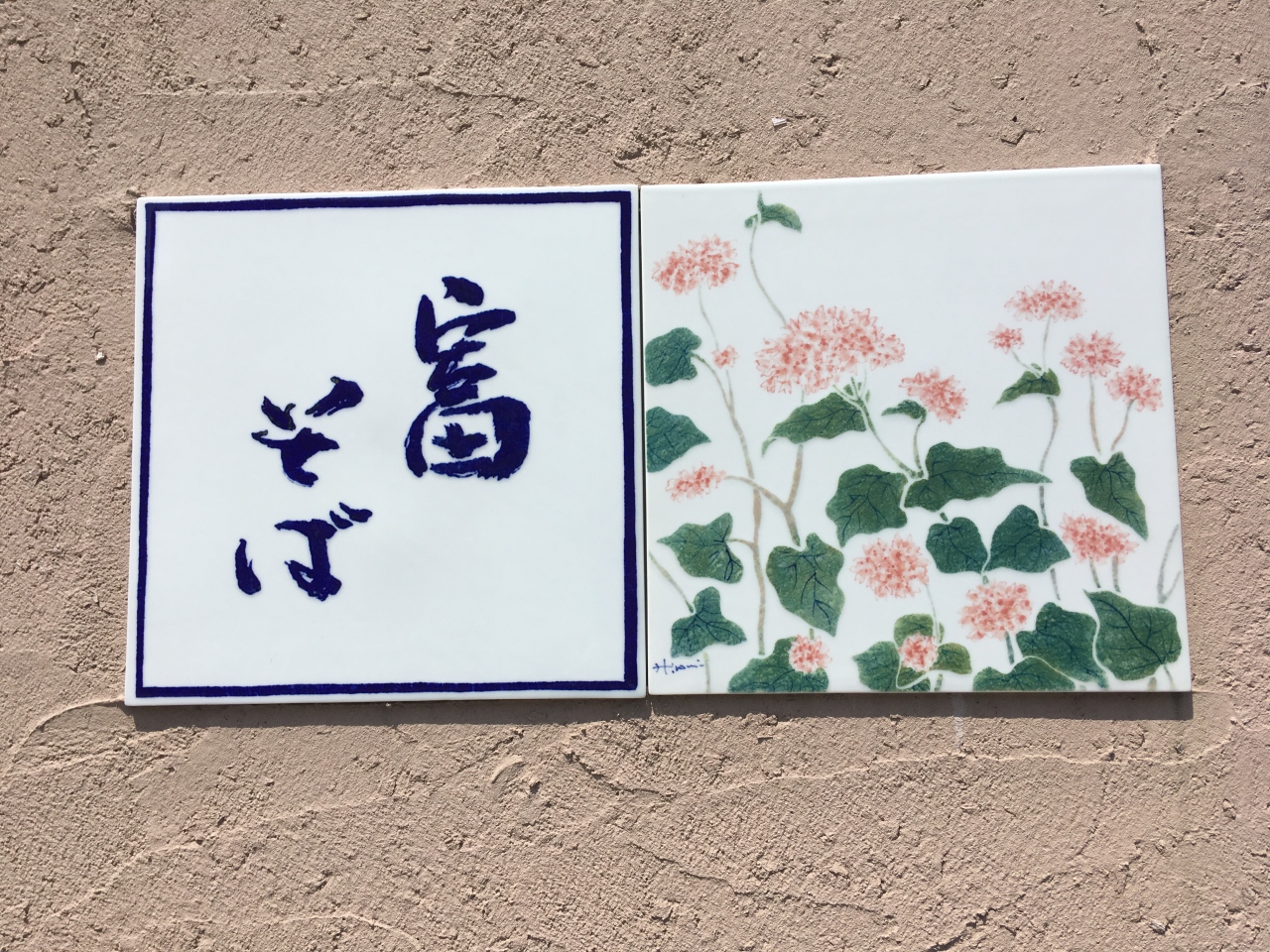 砥部焼の街らしく、店名表示タイル(表札)、床に埋め込まれた砥部焼の欠片、飾られた陶器などいい雰囲気。