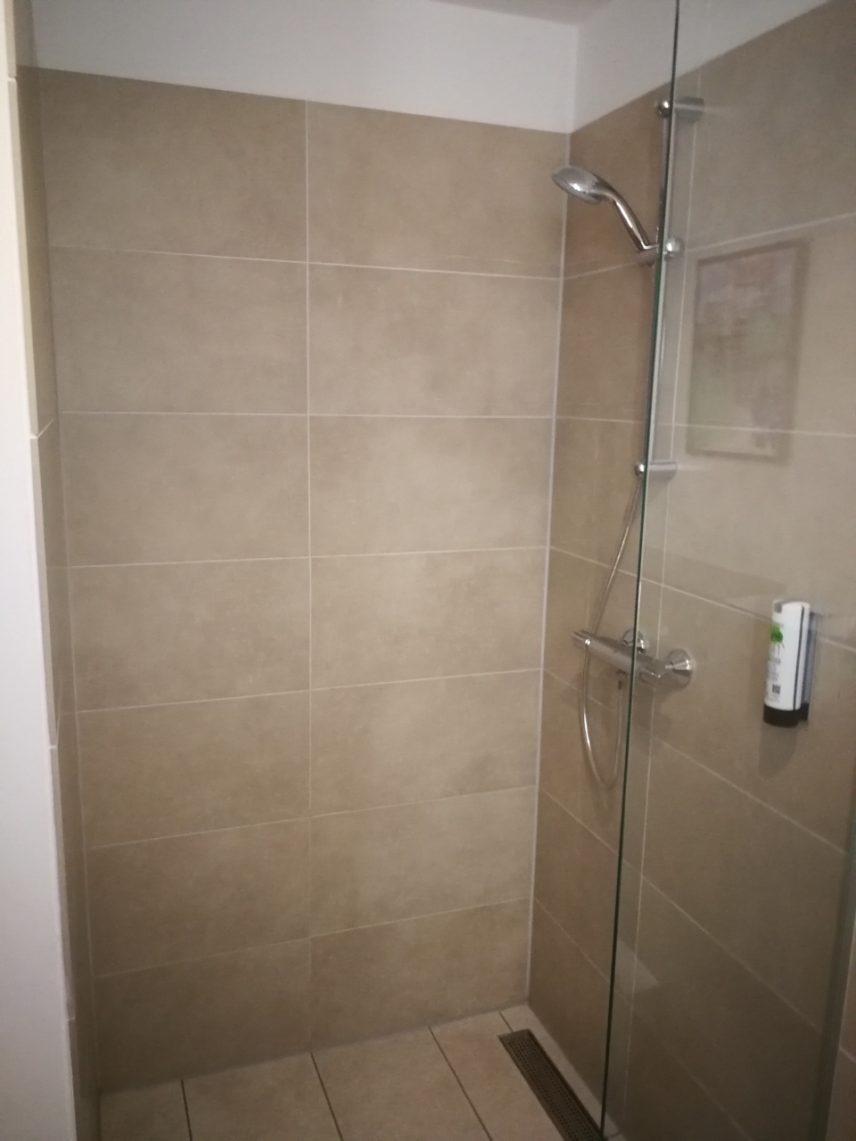 ヨーロッパによくあるタイプのシャワールームでドアがなぜか半分しかついていないので、トイレの方まで濡れてしまいますが、慣れているのでそこまで気になりません。