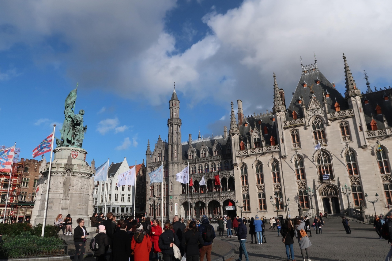 EU、ベルギー、ブルージュの各旗がなびいてる景色がとても美しいです。