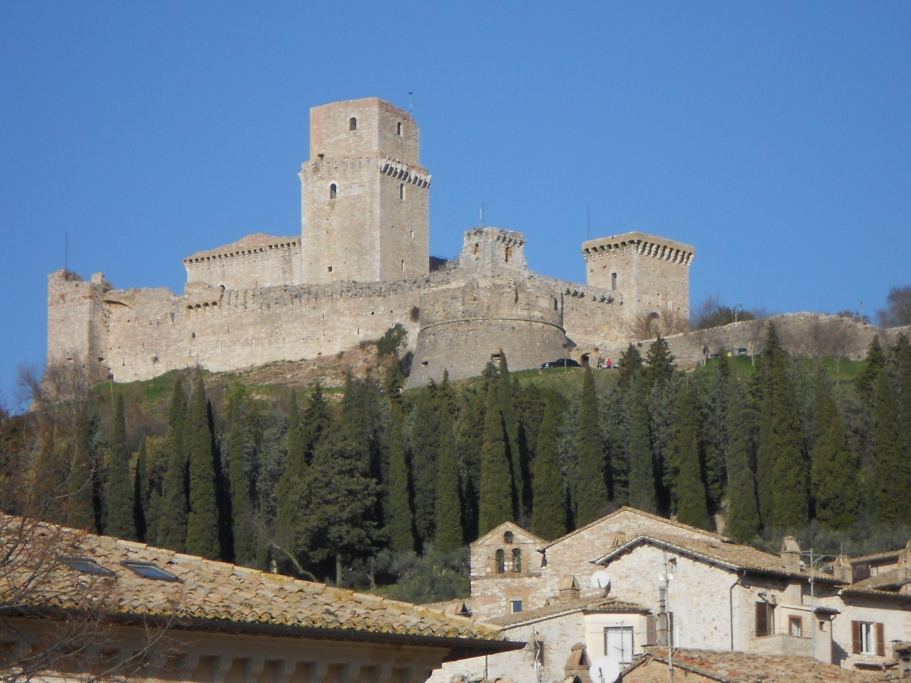 サンタ・キアーラ広場から山の頂を見上げると、ロッカ・マッジョーレ(Rocca Maggiore)が見えます。