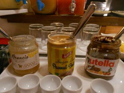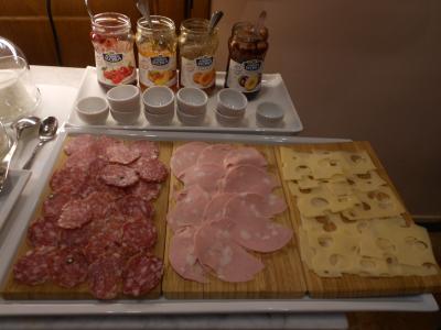 朝食ブッフェはハム・サラミ・チーズ・ヨーグルト・シリアル・クロワッサン・ケーキ・ヌテッラ・