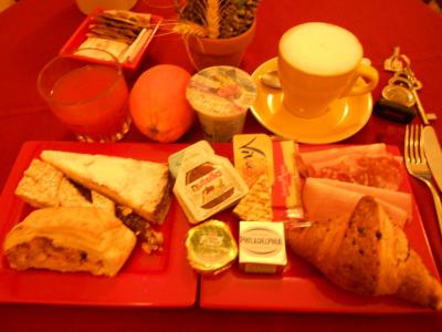 朝食はクロワッサンが無く硬いパン、ハム・サラミ・チーズ・シリアル・ヨーグルト・