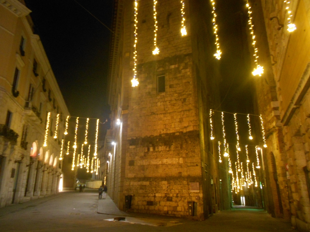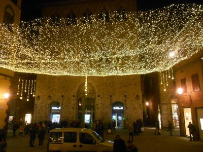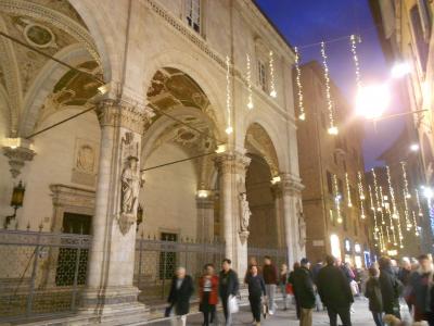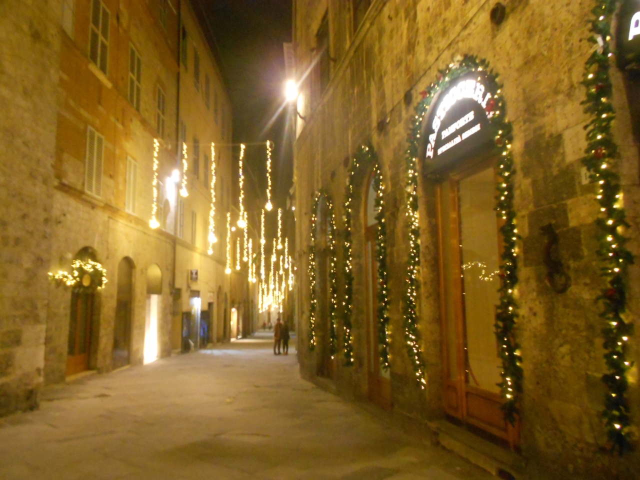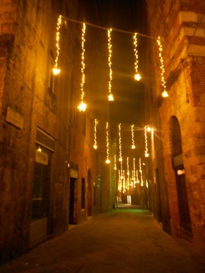 華やかなメインストリートとは異なり、シエナで暮らす人々の生活の場という感じの、穏やかで静かな小道です。両側には石造りの古い建物が立ち並んでいます。真夜中のこの小道は人通りも無く、柔らかなオレンジ色のイルミネーションの光に包まれ、まるで中世にタイムスリップしたかのようでした。