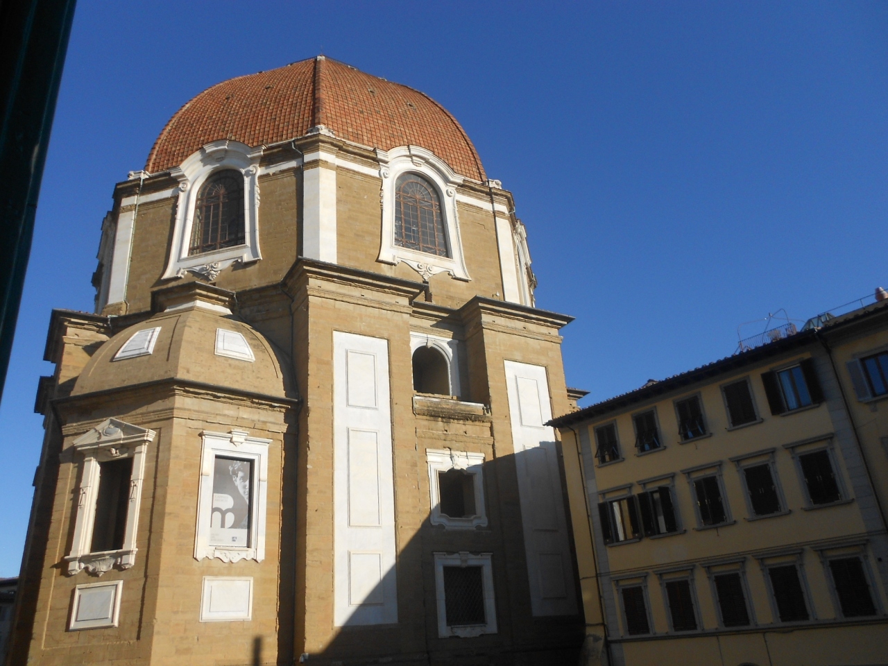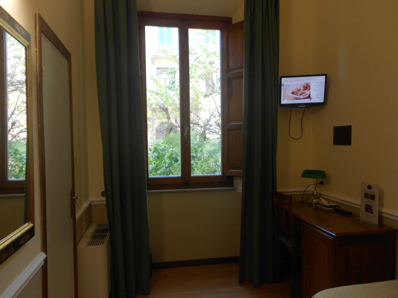 2階の角部屋ダブルルーム。窓を開けると広場とメディチ家礼拝堂のクーポラが