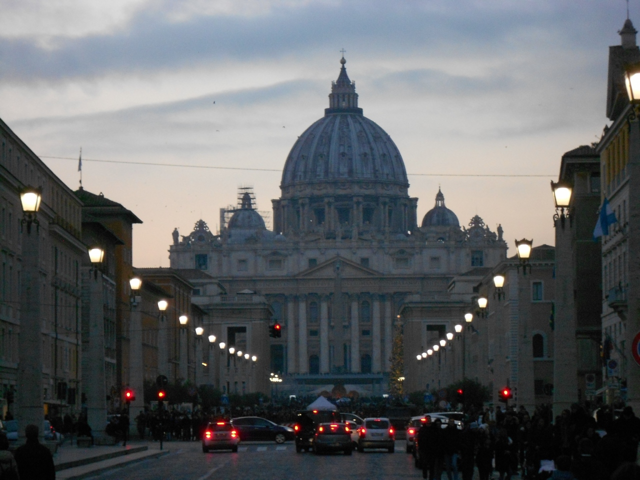 夕方4時50分、コンチリアッツィオーネ通りの真正面から望む、大クーポラが美しいサン・ピエトロ大聖堂。両側のローマの街並みの奥に堂々とした大聖堂の佇まいが、なんとも美しい構図です。この風景が日常のローマ!ローマ市民が羨ましいです!